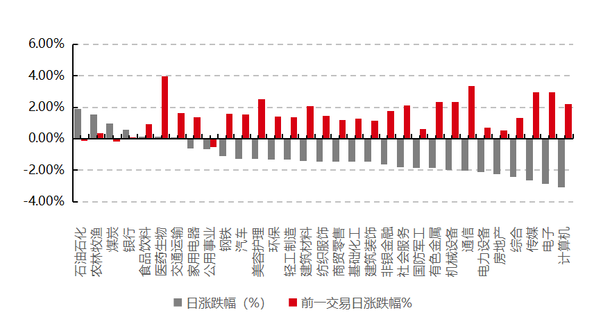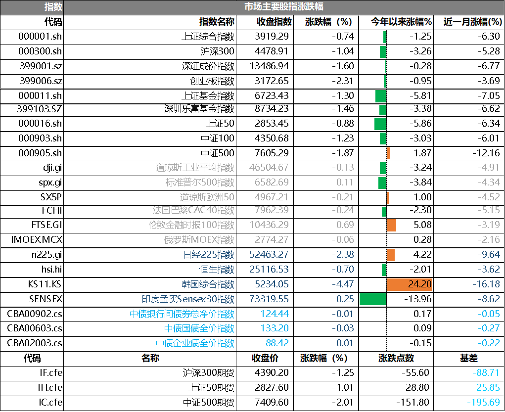 31個(gè)申萬(wàn)一級(jí)行業(yè)中有7個(gè)行業(yè)上漲。其中,石油石化、農(nóng)林牧漁、煤炭表現(xiàn)居前,漲跌幅分別為1.88%、1.53%、0.98%,傳媒、電子、計(jì)算機(jī)表現(xiàn)居后,漲跌幅分別為-2.64%、-2.86%、-3.11%。滬市有438只個(gè)數(shù)上漲,占比18.99%,深市有455只個(gè)數(shù)上漲,占比15.78%。非ST個(gè)股中,29只個(gè)股漲停,10只個(gè)股跌停。股指期貨主力合約3個(gè)合約均下跌,其中,0只期指好于現(xiàn)貨指數(shù)。